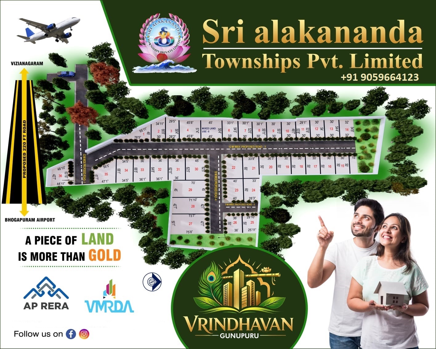 Here is a well planned Plots & Land for sale with VMRDA approved, great investment returns in Visakhapatnam, Vizianagaram. Extending in the area from 200 Sq Yards to 400+ Sq Yards Plots, this Vaastu completed Plots offers you an array of necessary and modern facilities such as Corporation water, Drainage facility, Club House, Swimming pool, Play ground, Walker Park, Rain water harvesting, Plantation Avenue, Water treatment... It is East, West, North and South facing residential / commercial Plots & Land available for sale at a competitive price. With great connectivity of National Highway-26, the development is definitely an ideal site to build your dream property in Chinnapuram, Korukonda, Nellimarla, Gotlam, Akkivaram Village. Enjoy the unparalleled living experience that the plot ( Sri Alakananda Township Private Limited VMRDA VUDA Private Layouts ) offers you.